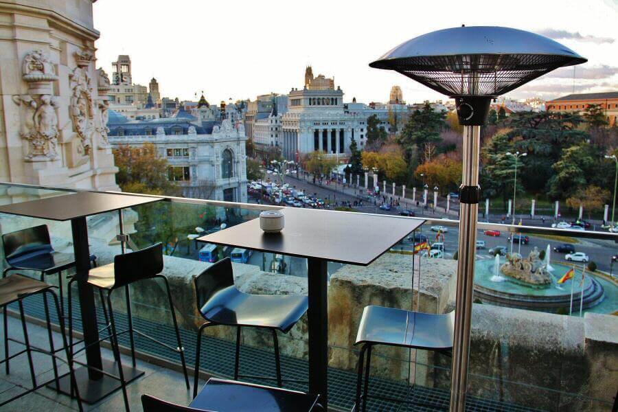 En la Plaza de Cibeles, Madrid, se encuentra el restaurante del Palacio de Cibeles. La terraza restaurante es una de las mejores terrazas de la capital. Las vistas que se contemplan desde allí son magníficas. La diosa Cibeles, protagonista indiscutible, Castellana y calle de Alcalá.